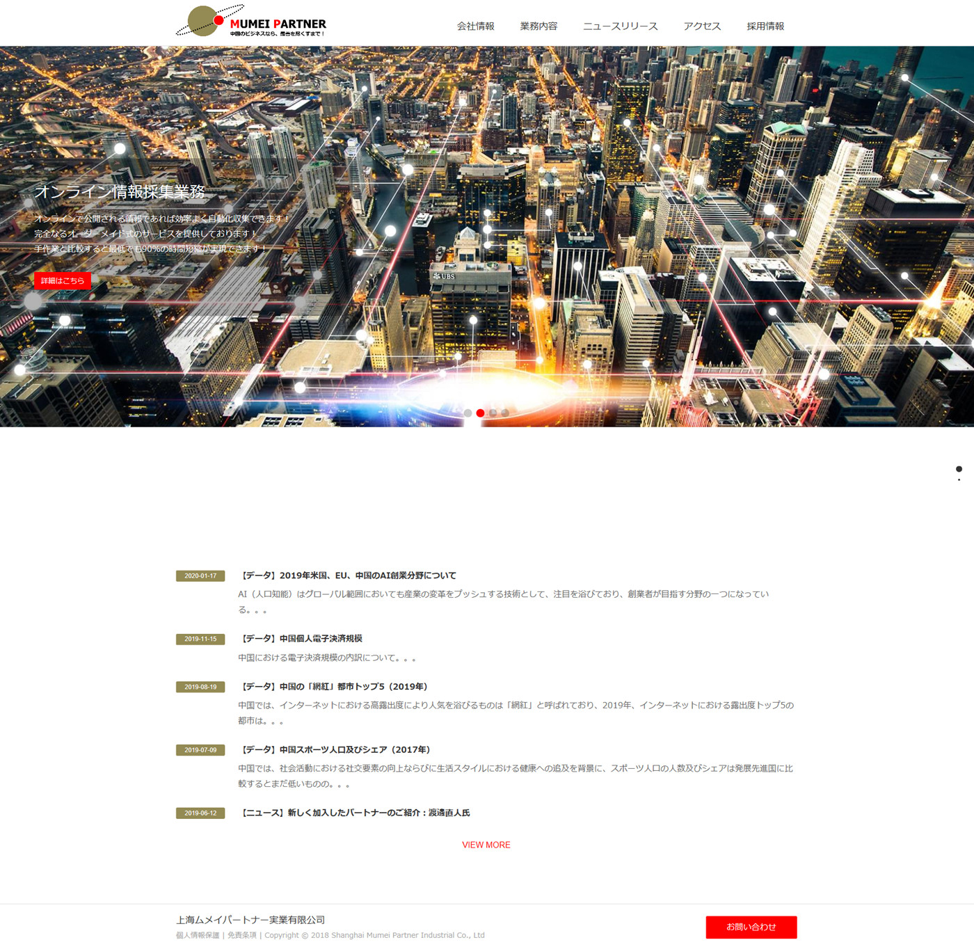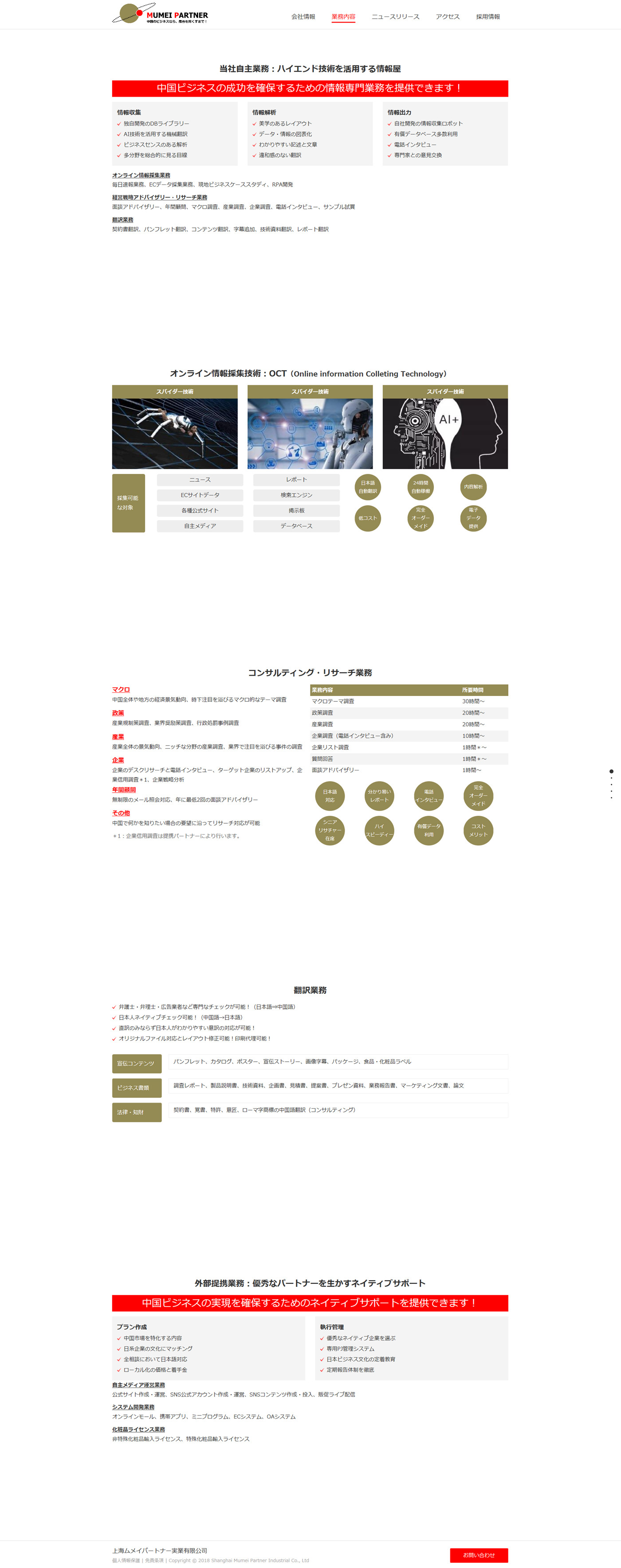 公司主要為日本企業(yè)在中國提供投資、經(jīng)營以及法律等服務(wù)。九城科技結(jié)合企業(yè)日本客戶上網(wǎng)體驗(yàn),優(yōu)化頁面,網(wǎng)頁設(shè)計(jì)簡潔,為客戶提供了網(wǎng)站設(shè)計(jì)以及程序后臺開發(fā)服務(wù)!